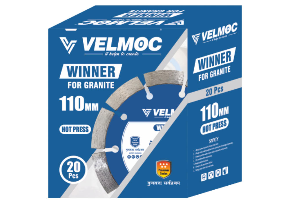 Velmoc Winner Diamond Saw Blade (110MM) features 9 segments, 20MM bore, and hot press technology for durable granite cutting. Designed for high performance up to 15,000 RPM, it ensures smooth, precise cuts on hard stone surfaces for professional use.