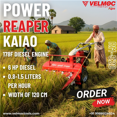 Power Reaper - RM-520 is designed for efficient reaping of rice and wheat. It features a 178F, 6 HP diesel engine with a fuel consumption of 0.8-1.5 liters per hour. The reaper has a working width of 120 cm and operates with a reciprocating blade bar.